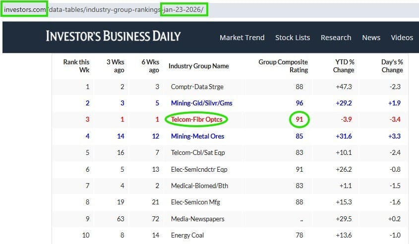 Quick recap . . . . in the summer of 2025 the Industry Group Telecom - Fiber Optics absolutely rocketed up the rankings from near 100ish to the #1 spot. This ultimately led us to very appealing entries on these two stocks. We like to use the groups for many reasons. One way to use the groups is using them to find new opportunities. Winning stocks tend to move in groups. Stocks move in groups in a general sense in both directions, but big winners can really gather a lot of steam moving as a group. Here’s the group right now: